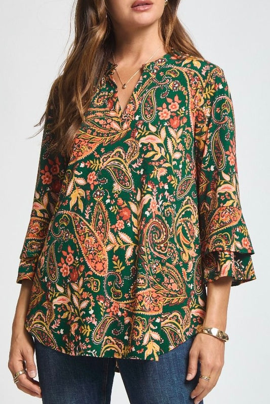 Hunter/Gold Flora 3/4 Bell Sleeve Anti-Wrinkle Top