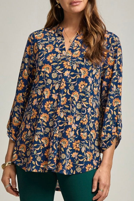 Navy/Rust Floral 3/4 Rolled Tab Anti-Wrinkle Top