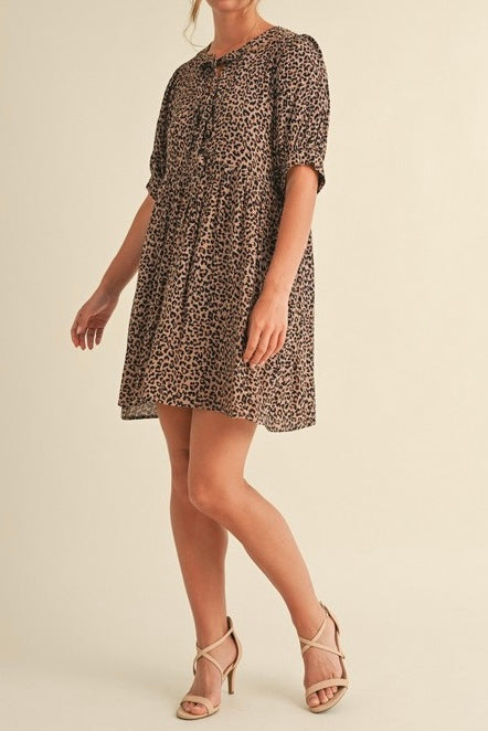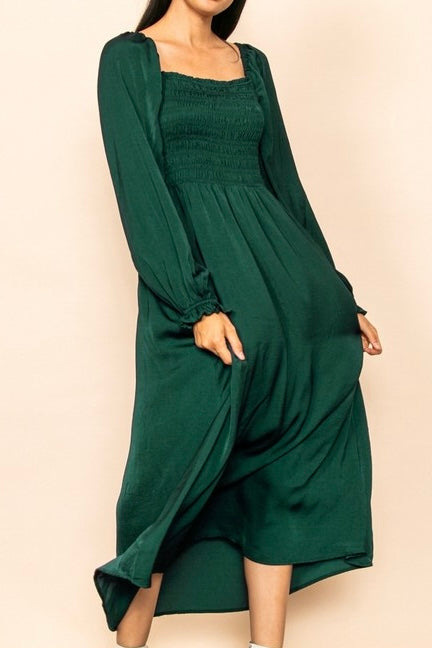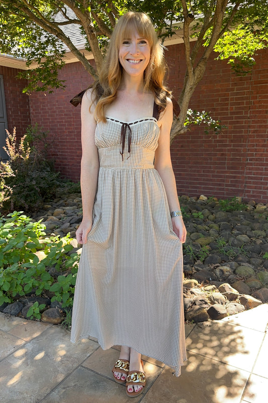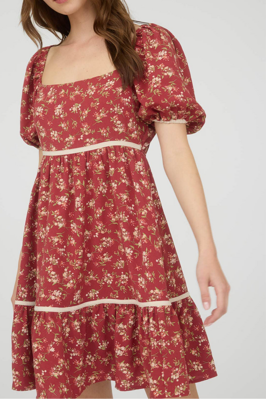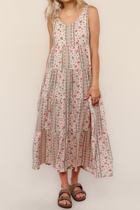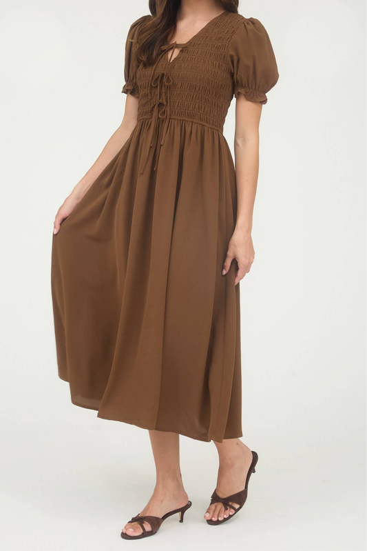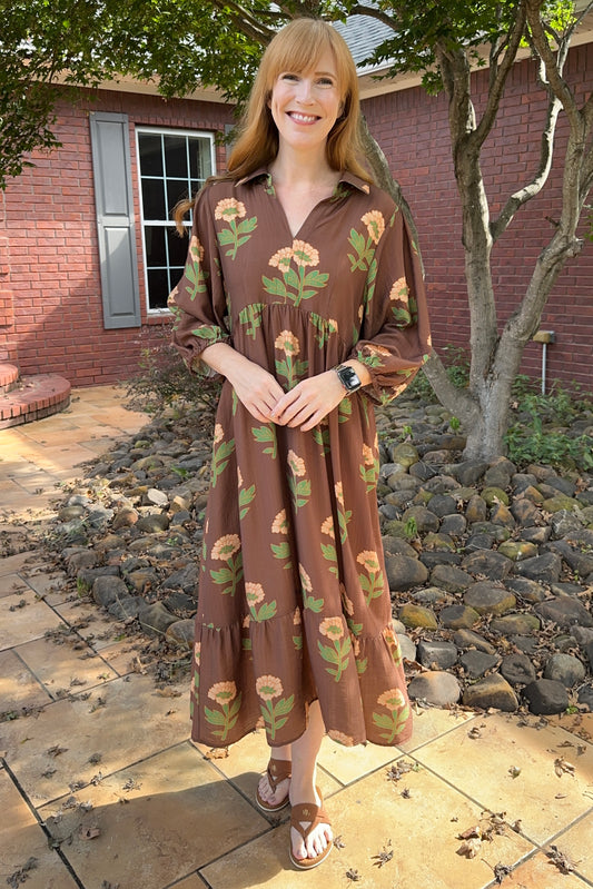 Brown/Rust/Green Floral Midi V-Neck Dress
