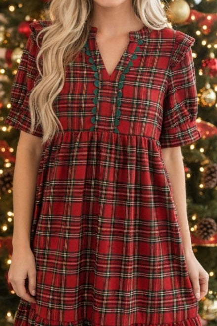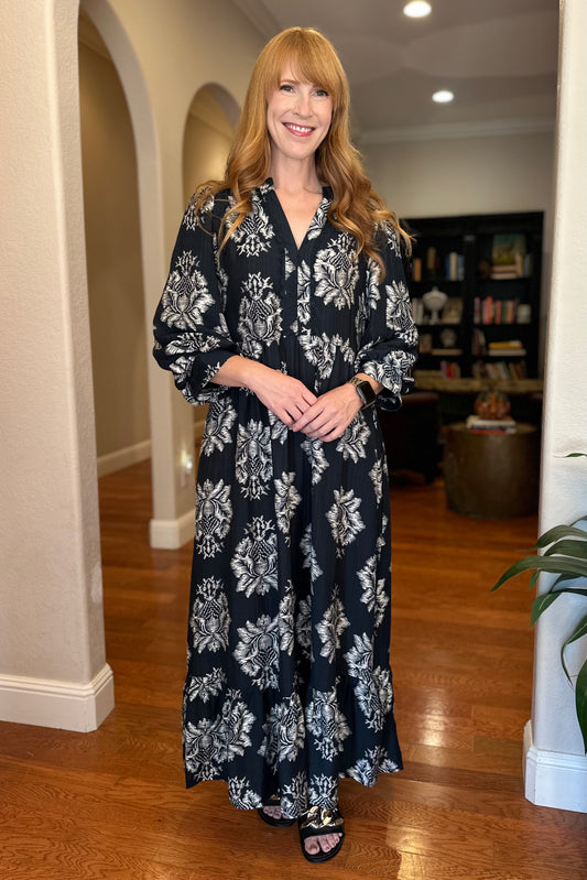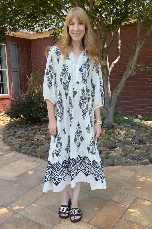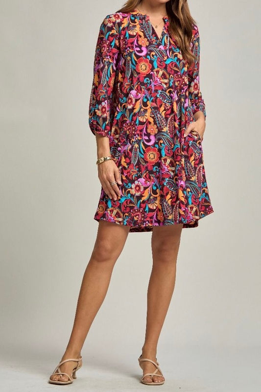 Navy/Rust/Green Floral Midi V-Neck Dress