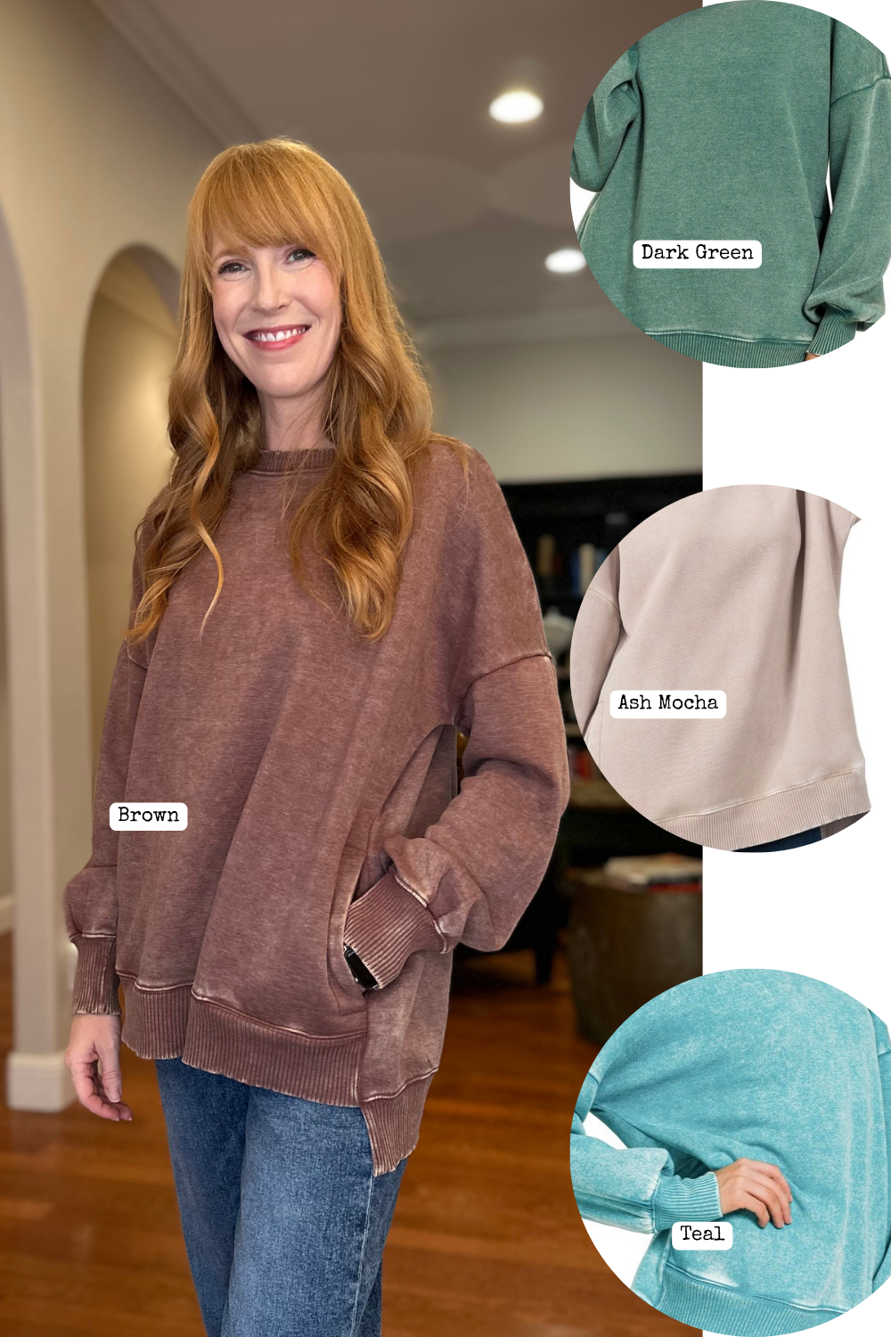 ACID WASH FLEECE HI-LOW HEM PULLOVER WITH POCKETS **Each item is unique, expect variations in color and finishing TOTAL BODY LENGTH: 27"(FRONT), BUST: 45" approx. - MEASURED FROM SMALL - TRIM: 58% COTTON 37% POLYESTER 5% SPANDEX