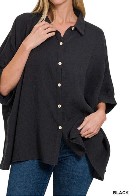 DOUBLE GAUZE 3/4 SLEEVE BUTTON UP SHIRT - HI-LOW HEM - FRONT BUTTON CLOSURE - OVERSIZED FIT TOTAL BODY LENGTH: 25.5", BUST: 67" approx. - MEASURED FROM S/M