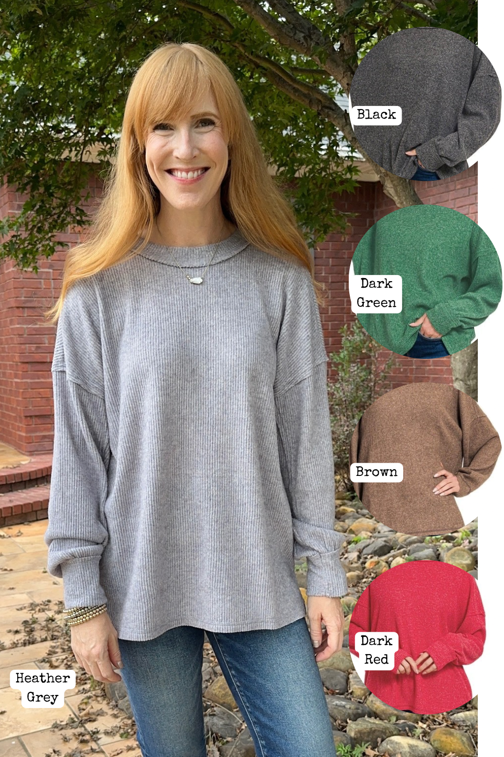 Brushed Ribbed Reverse Seam Drop Shoulder Top