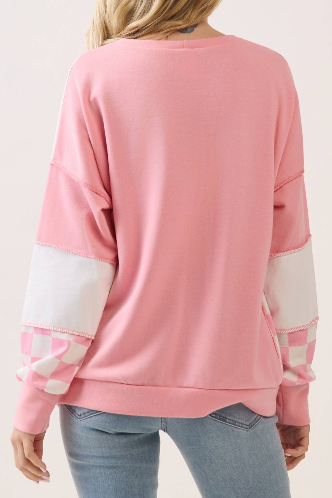 TRENDY RIB KNIT PATCHWORK PULLOVER SWEATSHIRT FEATURING A CHECKERED PRINT, CREW NECKLINE, EXPOSED STITCH DETAILING, COLOR BLOCK PANELS, DROP SHOULDER, AND A RELAXED FIT.