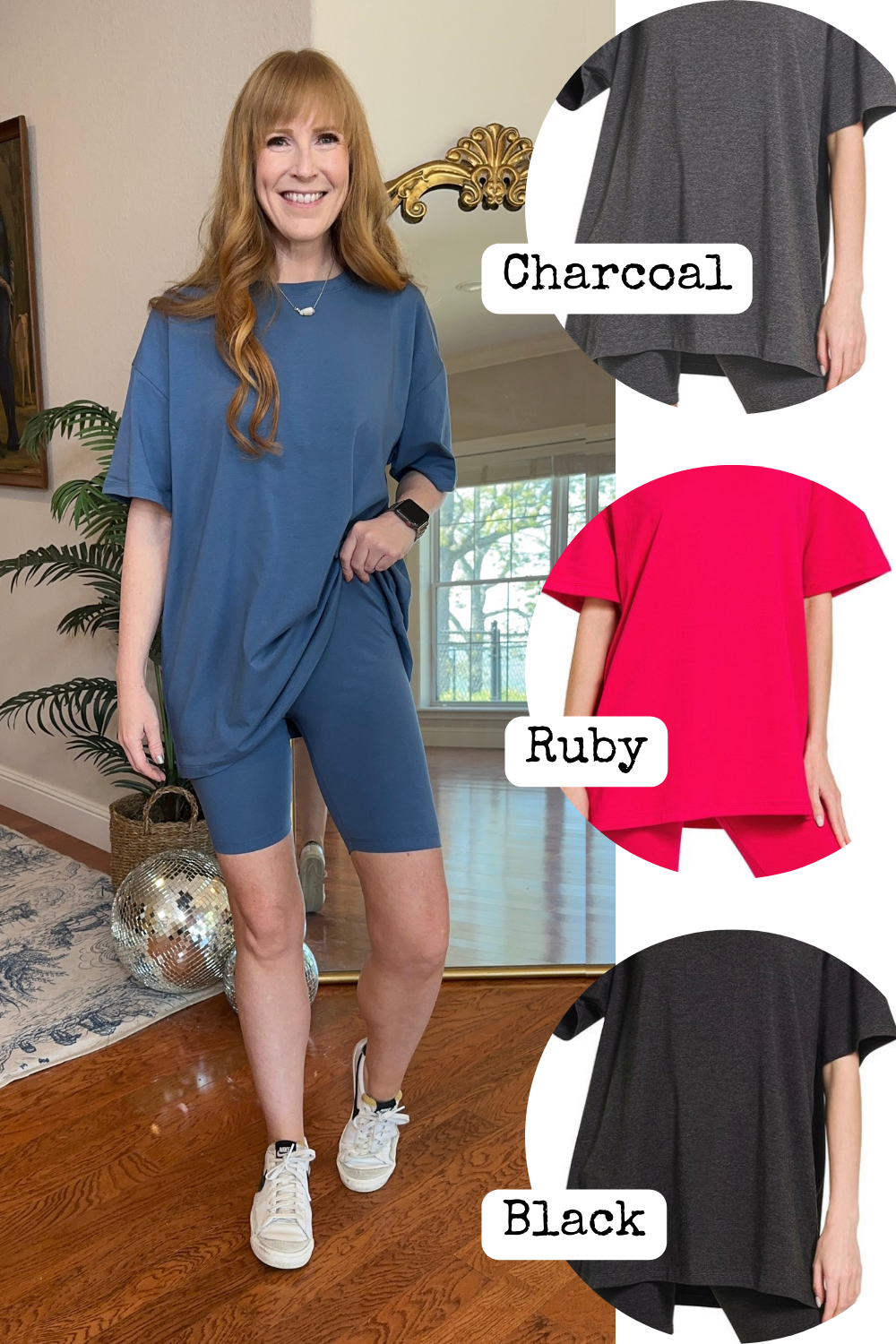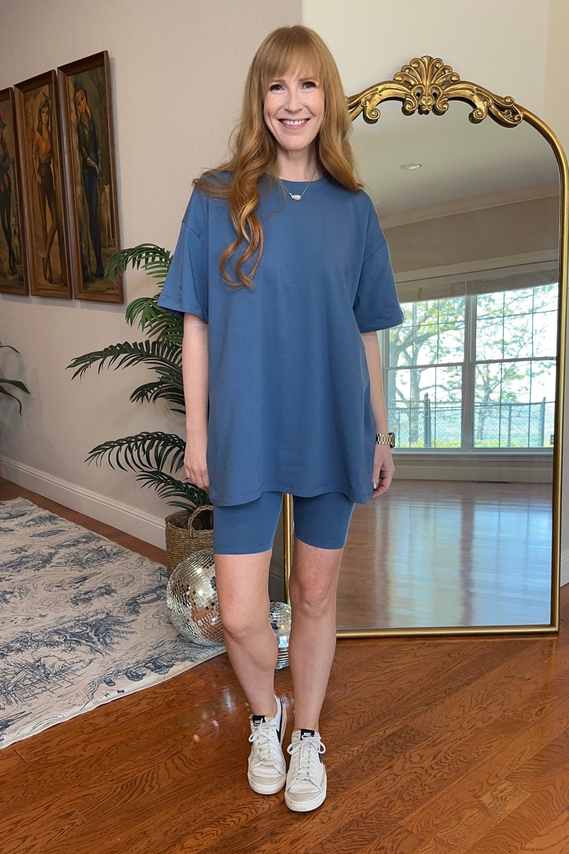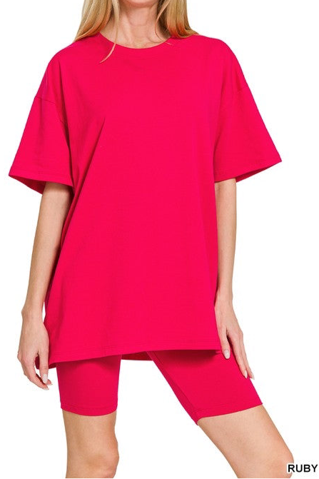 COTTON ROUND NECK TOP & BIKER SHORTS SET - ROUND NECK - BIKER SHORTS * TOP TOTAL BODY LENGTH: 29.5", BUST: 49" approx. - MEASURED FROM SMALL * SHORTS TOTAL WAIST: 22", INSEAM: 8.5" approx. - MEASURED FROM SMALL
