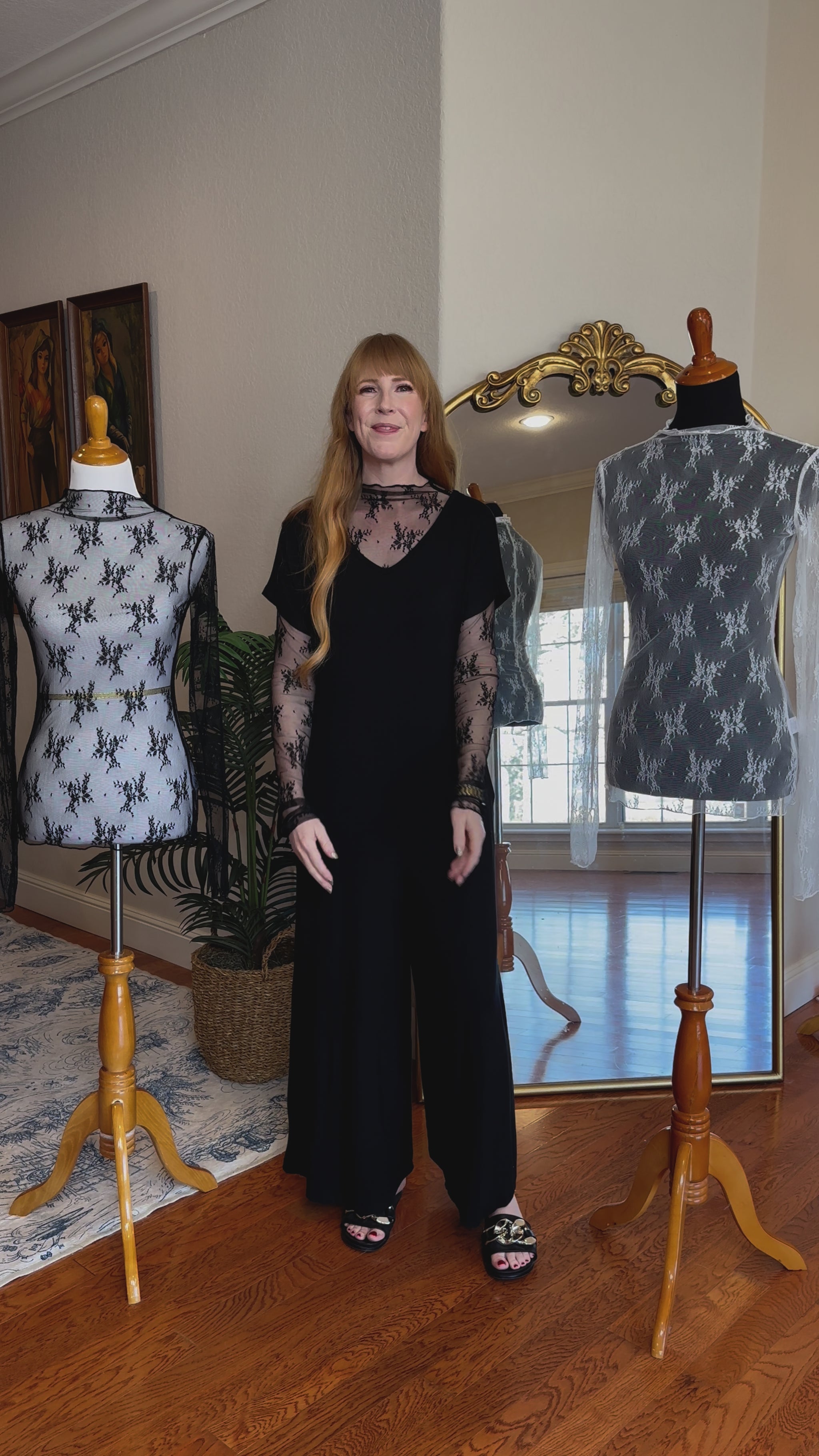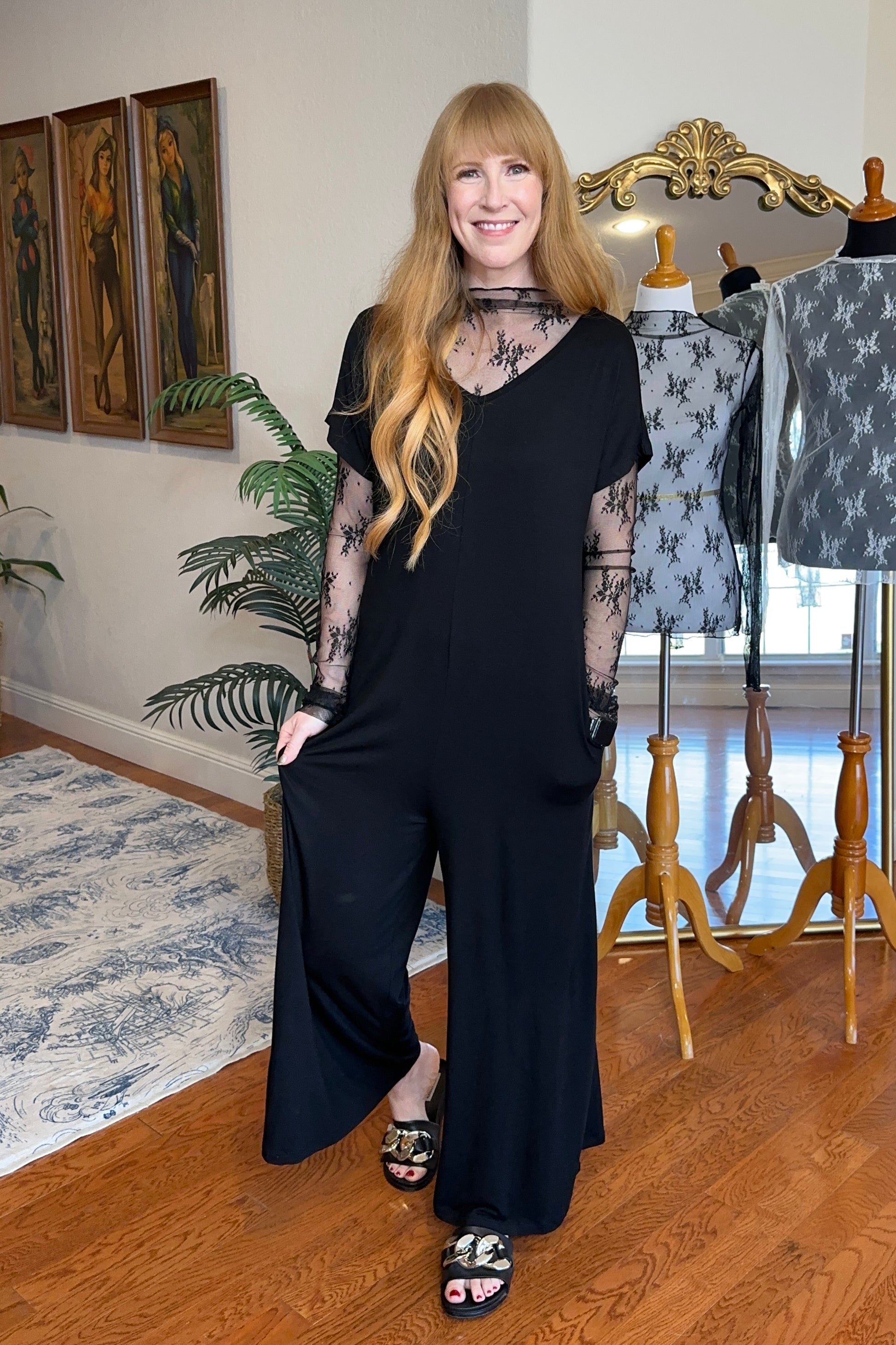 SHORT SLEEVE SOLID JUMPSUIT WITH POCKETS 95% Rayon 5% Spandex. Model is wearing size S and is 5'10” MADE in USA