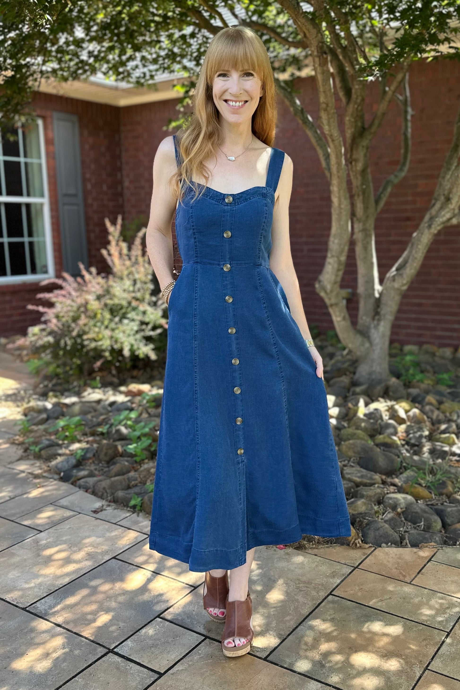 SWEETHEART NECKLINE SLEEVELESS WIDE STRAP ADJUSTABLE STRAP BUTTON DOWN NON-FUNCTIONAL BUTTONS BACK SMOCKING NOT LINED CHAMBRAY /DENIM PATTERN MAXI DRESS 100% LYOCELL