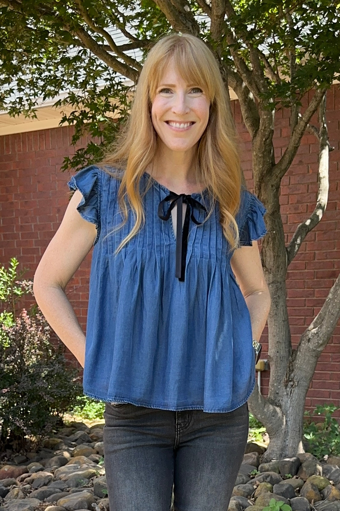 ROUND NECKLINE SHORT SLEEVES RUFFLE SLEEVES PLEATED YOKE DETAIL CONTRAST FRONT TIE DETAIL RELAXED FIT NOT LINED DARK CHAMBRAY PATTERN WOVEN TOP SELF: 100% LYOCELL CONTRAST: 100% POLYESTER