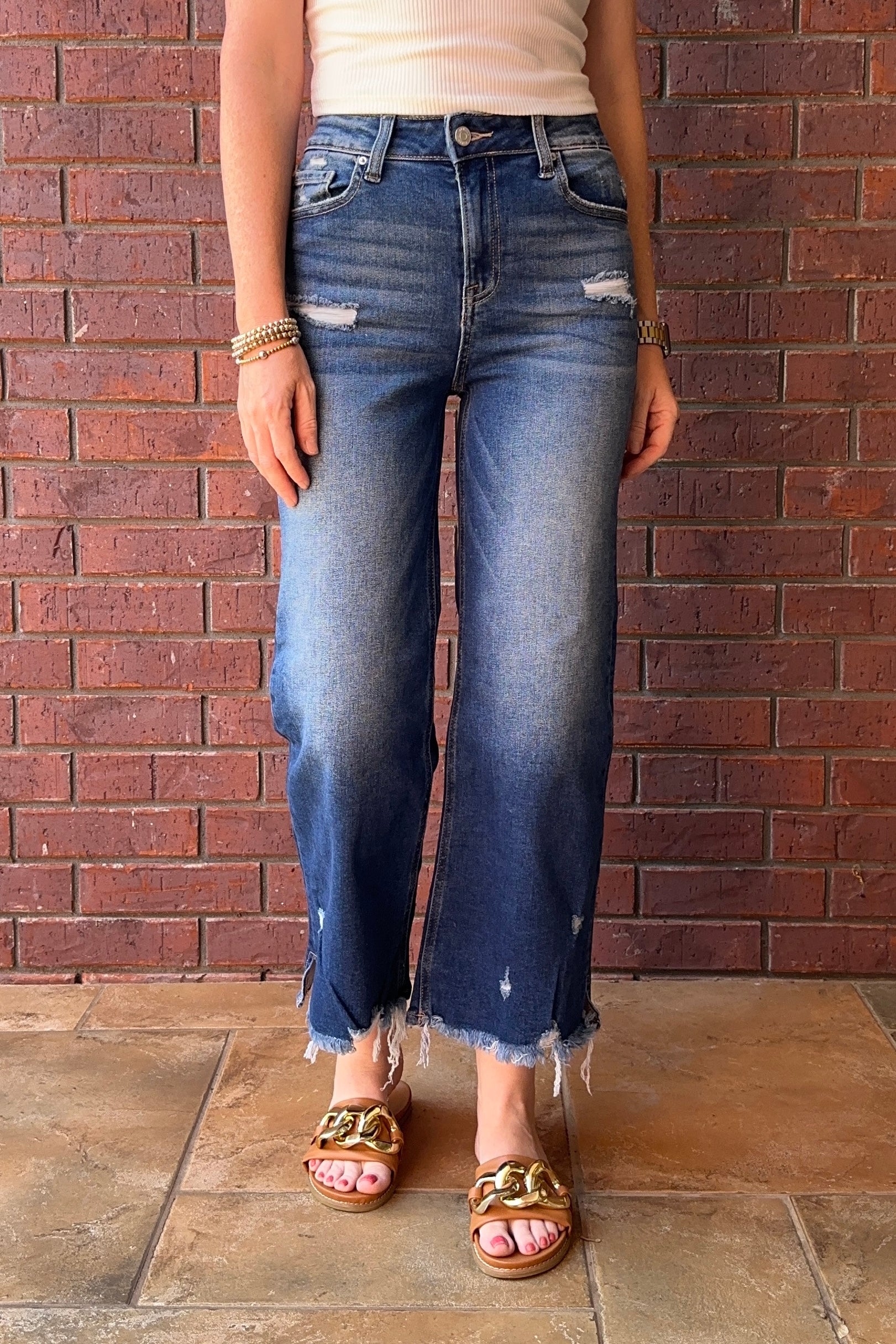 DISTRESSED RAW HEM DENIM PANTS -STRETCH FRONT RISE: 10.75", INSEAM: 26.5" approx. LEG OPENING: 21.25" approx. * MEASURED FROM SIZE 26
