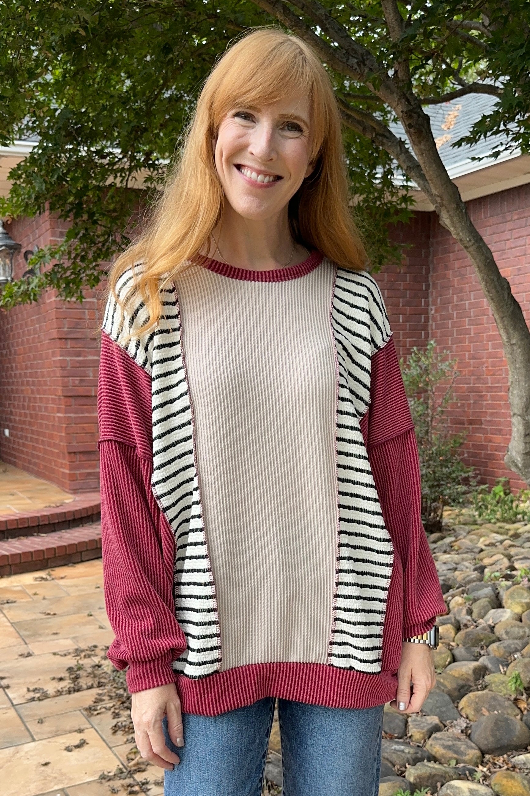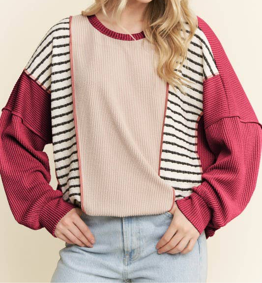 95% POLYESTER 5% SPANDEX LONG SLEEVE ROUND NECK SOLID URBAN RIB AND JACQUARD STRIPE COLOR BLOCK KNIT TOP