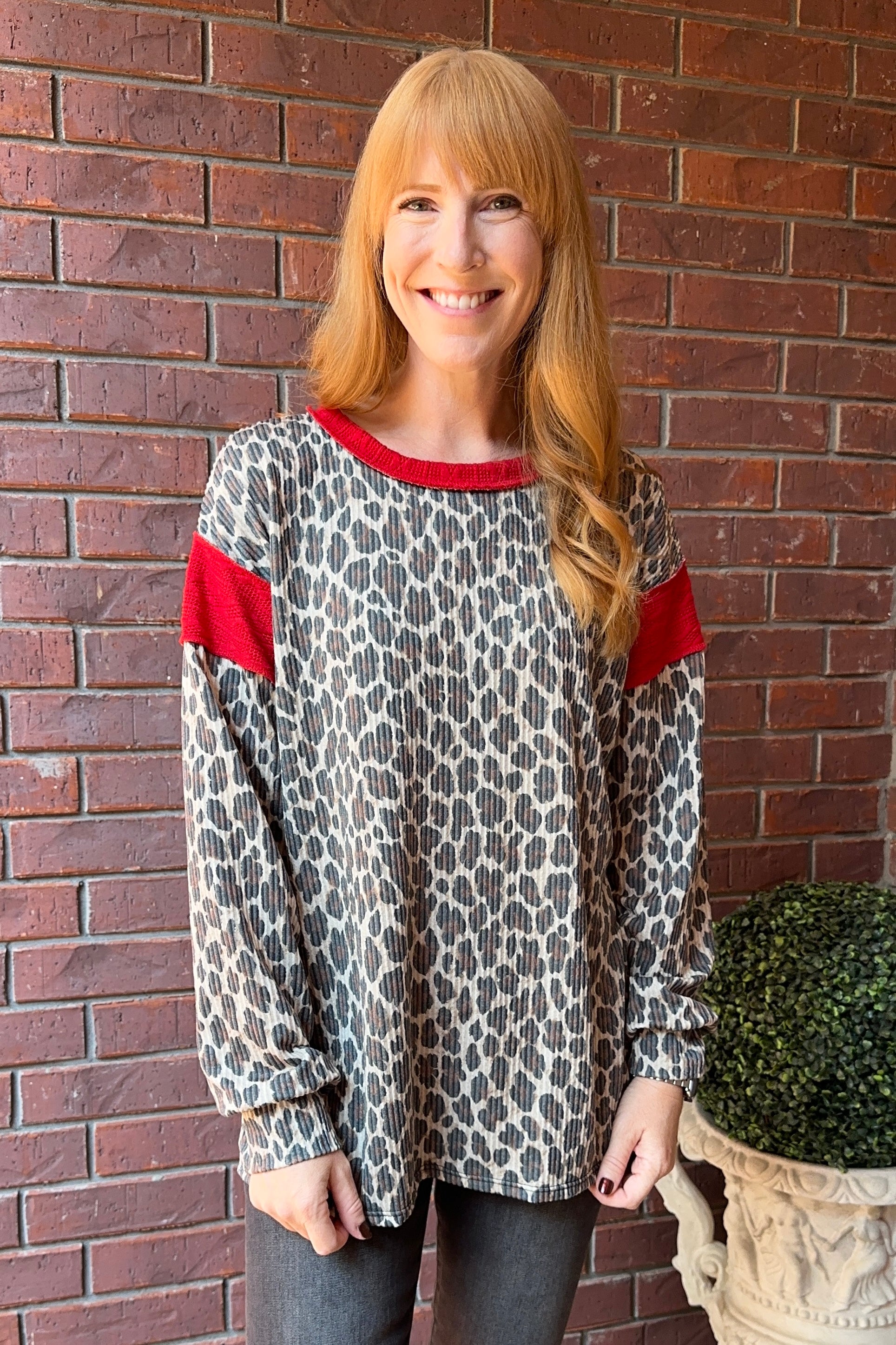 95% POLYESTER 5% SPANDEX LONG PUFF SLEEVE ROUND NECK ANIMAL URBAN RIB AND SOLID CONTRAST TOP MODEL SIZE: HEIGHT 5'6" BUST 32", WAIST 2", HIPS 32" WEARING SIZE: SMALL