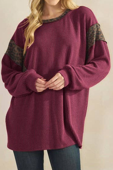 95% POLYESTER 5% SPANDEX LONG SLEEVE ROUND NECK SOLID AND ANIMAL URBAN RIB CONTRAST TOP