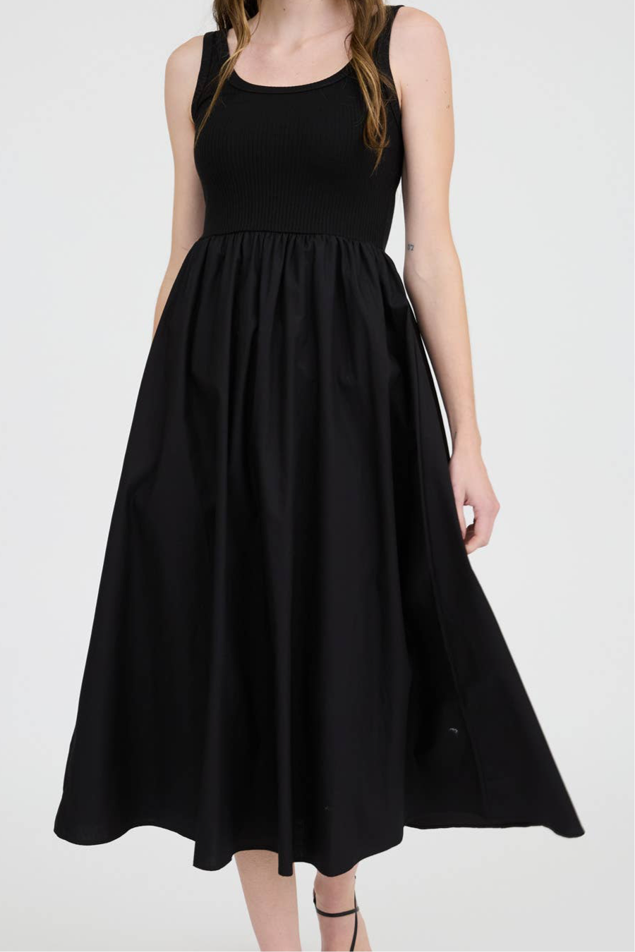 SLEEVELESS KNIT TANK BODICE A-LINE SKIRT SOLID MIDI DRESS MIX MEDIA LINED SELF: 65% POLYESTER, 28% RAYON, 7% SPANDEX CONTRAST: 100% COTTON LINING: 100% POLYESTER