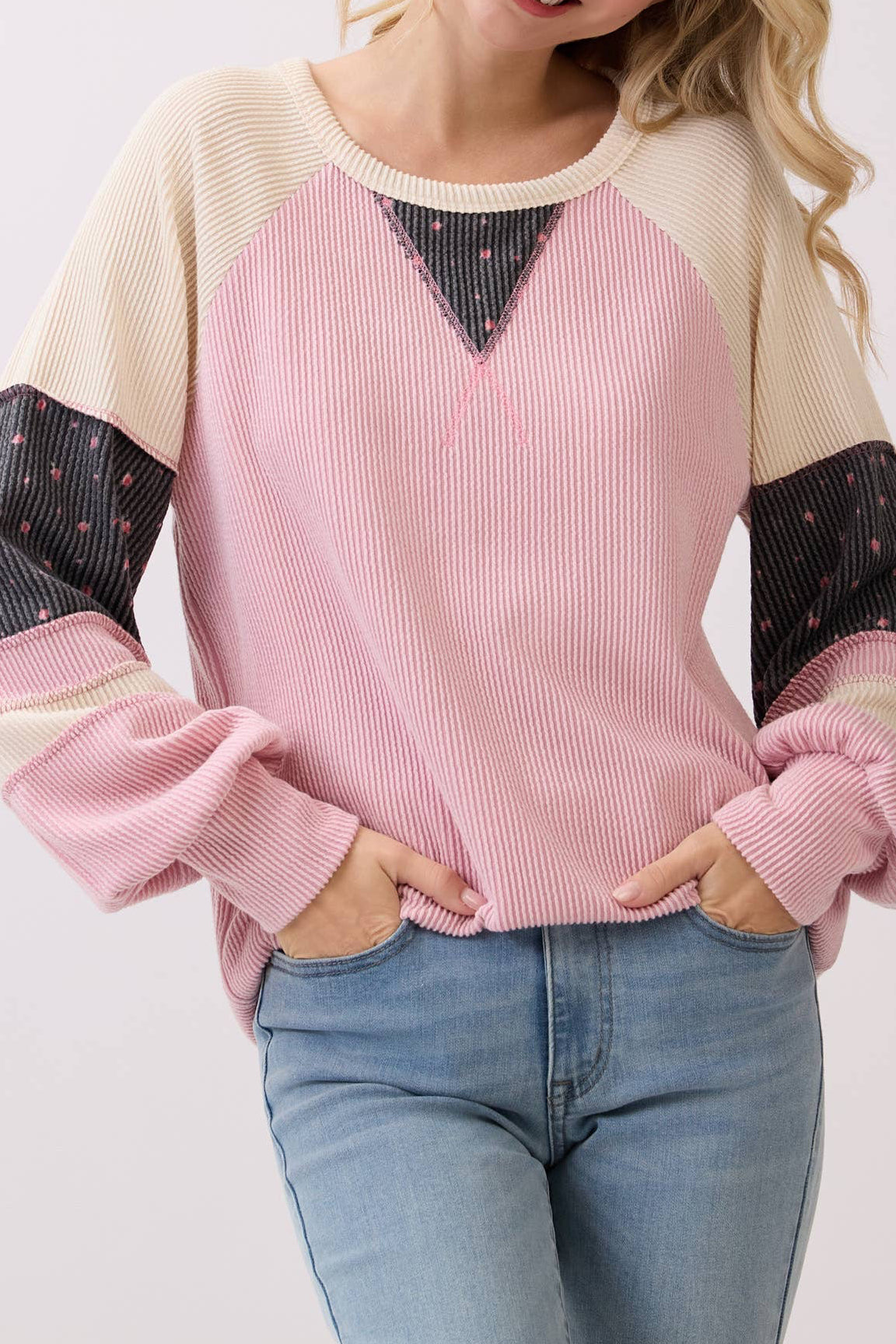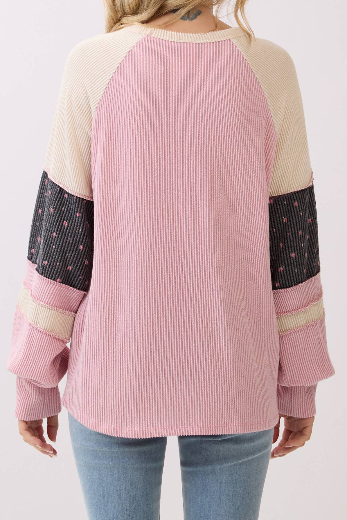 Pink Rib Color Block Floral Raglan Sleeves Pullover Top