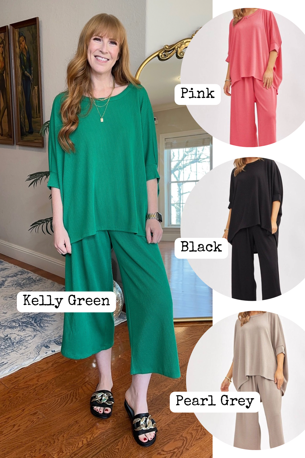 This beautiful solid jacquard set features a loose-fitting top and stylish wide-style pants, creating a chic and comfortable ensemble. The jacquard fabric adds a textured, sophisticated touch to the outfit, enhancing its elegance. The top offers a relaxed, easygoing fit, with a flattering silhouette while the pants have an elastic waistline. This set offers a perfect blend of comfort and contemporary style, ideal for casual and semi-formal occasions. • Inseam: 23' 1/8" • Model is 5’8” and wearing size Small