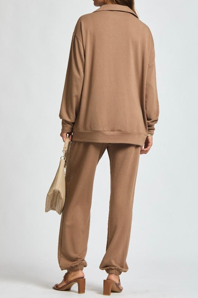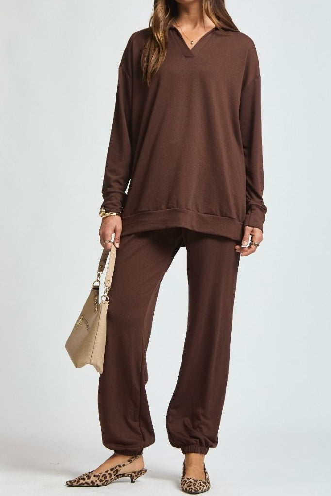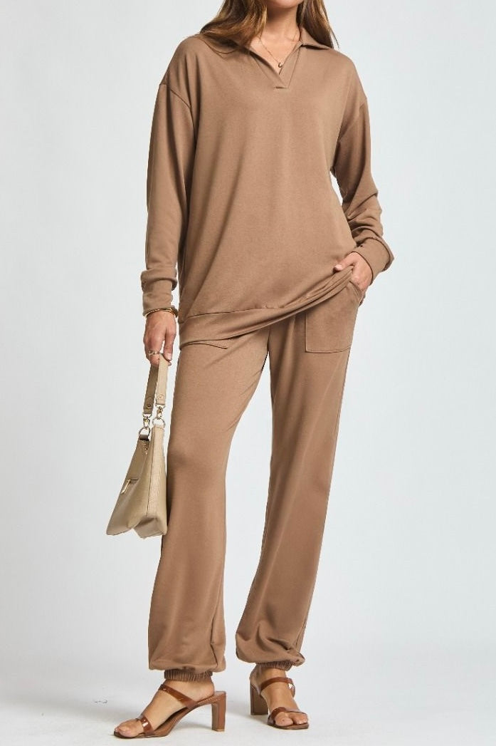 Stay stylish and comfortable in this 2 piece french terry set, featuring a collared top and matching jogger with pockets! Made from soft, breathable french terry fabric, this set offers the perfect balance of structure and ease. The collared top adds a polished touch, while the joggers keep things relaxed with an elastic waist and pockets.
