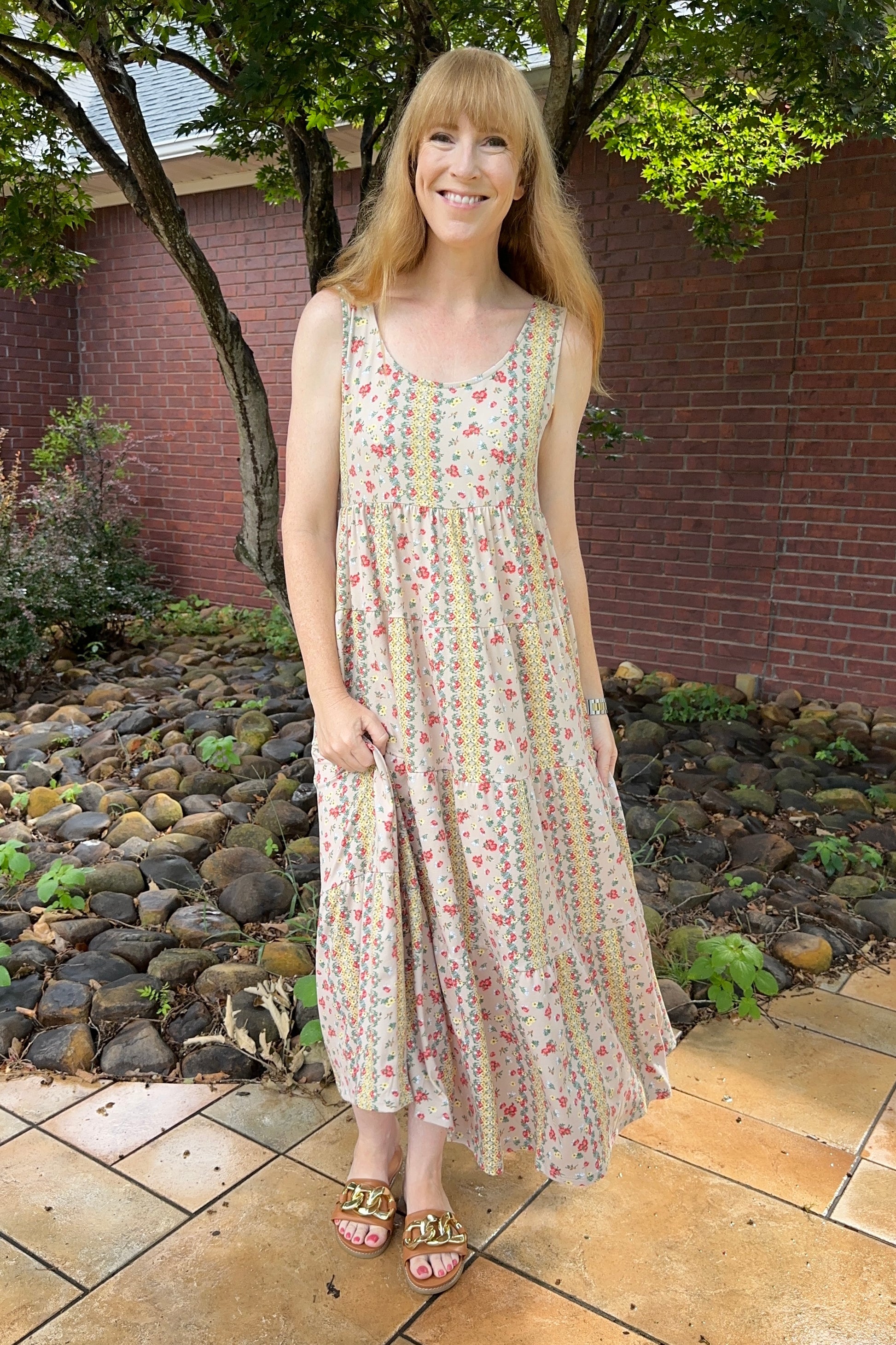 ROUND NECK SLEEVELESS BABYDOLL TIERED MIDI BOHEMIAN ETHNIC PRINT KNIT DRESS