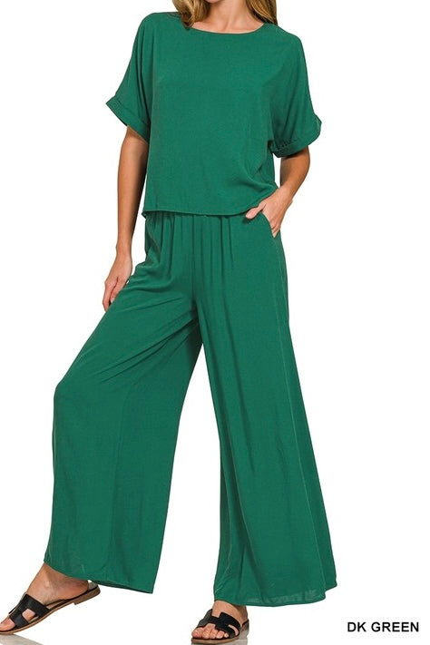WOVEN SHORT SLEEVE & LONG PANTS SET - RELAXED FIT - ELASTIC WAISTBAND PANTS ** TOP -DROP SHOULDER TOTAL BODY LENGTH: 21", BUST: 42" approx. - MEASURED FROM SMALL ** PANTS TOTAL WAIST: 25", INSEAM: 29" approx. - MEASURED FROM SMALL